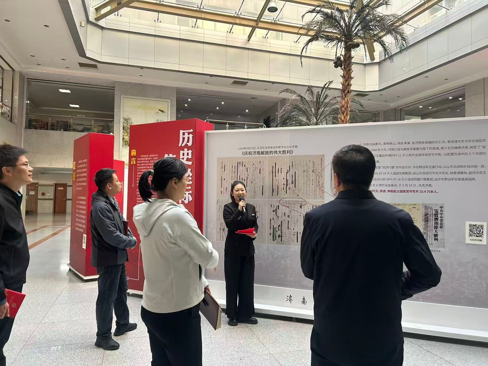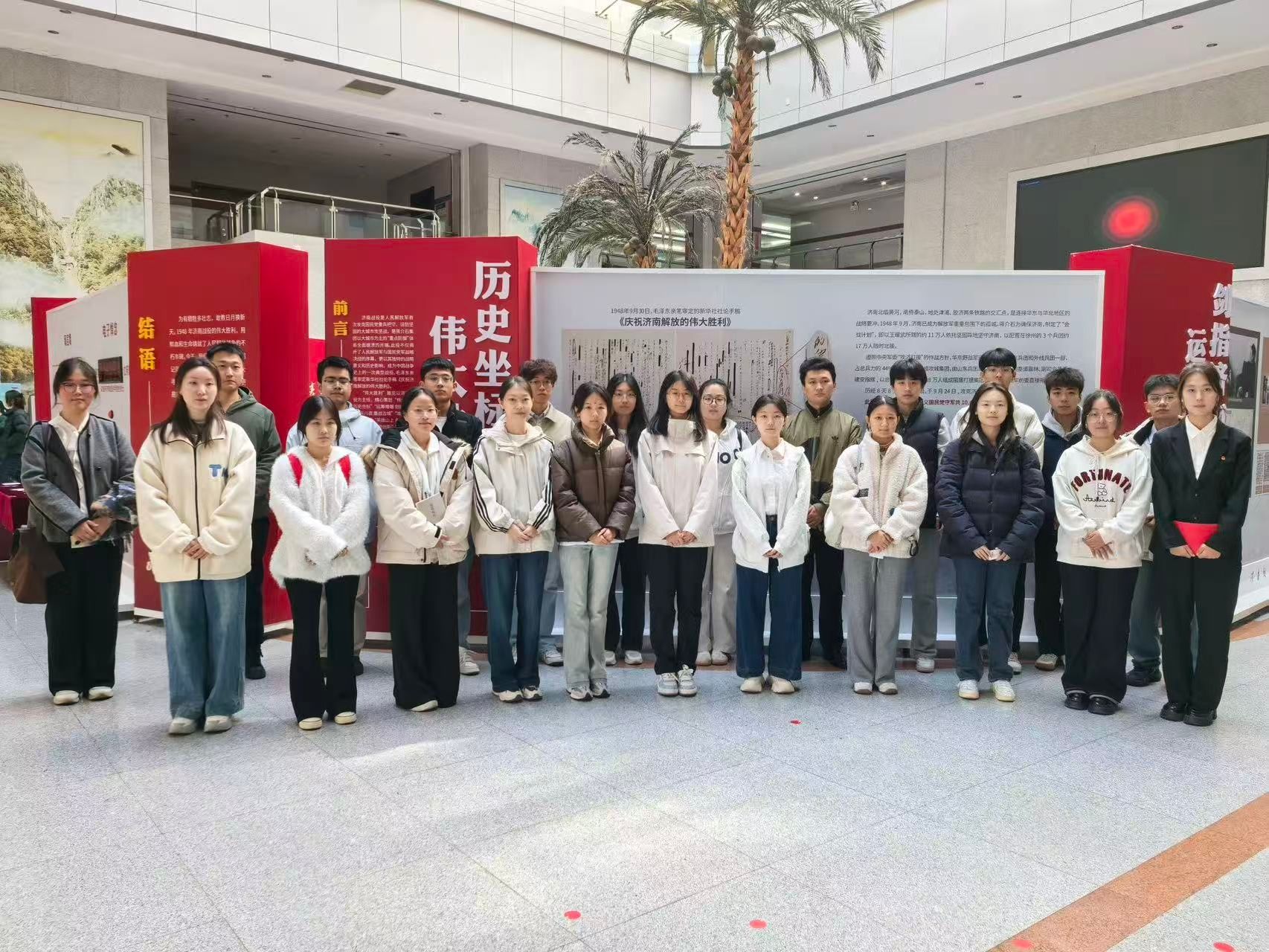“伟大胜利”济南战役史实展巡展以济南战役为主线,分为“伟大胜利 历史坐标”“八天八夜 鏖战古城”“褒扬英烈 探索创新”等八个部分,再现济南战役的烽火岁月,彰显英雄城市的红色记忆,激发爱党爱国爱社会主义的深厚情感。为确保讲解的专业性与感染力,学院志愿者们在活动前期认真研读济南战役相关史料,深入了解每一件展品、每一幅图片背后的故事,前往济南战役纪念馆接受专业讲解员的现场指导与培训。在讲解过程中,志愿者们以高度的责任心和饱满的热情接待参观团队,通过声情并茂的讲述,将巡展现场打造成一个移动的、沉浸式的“大思政课”实践课堂,将观众带回那个炮火纷飞又充满信仰的年代,让红色展陈“动”起来、革命故事“活”起来,真正实现革命精神可触可感可传承。