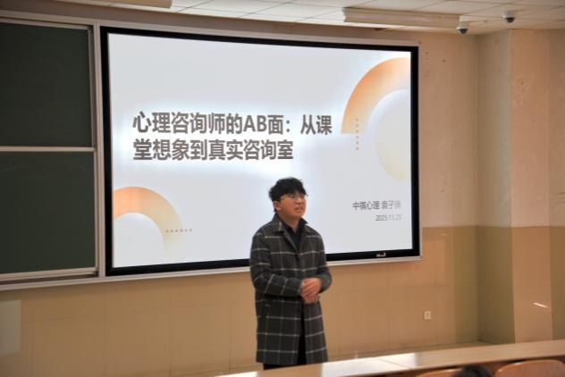 为帮助应用心理学专业学生具象化职业发展路径,科学规划生涯方向,破除对心理咨询行业的认知偏差,11月12日,永利3044官网特邀2019级优秀校友、山东中祺心理咨询有限公司资深心理咨询师袁子腾,开展《心理咨询师的AB面:从课堂到诊室的真实跨越》专题分享会,学院应用心理学专业学生现场参会。