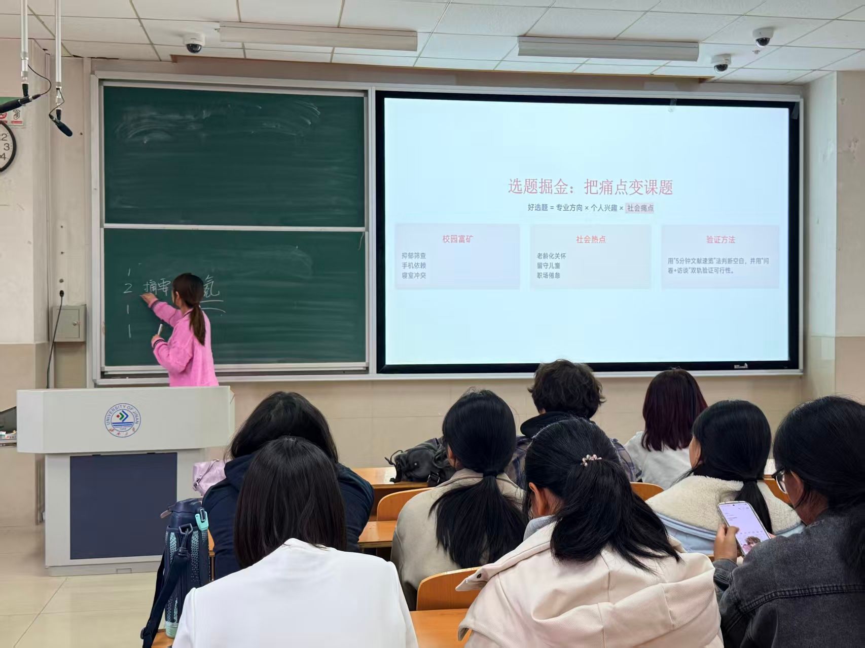 在宣讲会上,王依琳结合自身多次科创项目成功立项的丰富实践经验,深入剖析了参与科创赛事的关键环节。她以“科研设计、数据分析、文案撰写、商业思维”四大核心能力为切入点,着重强调了组建优势互补团队的重要性,并引导学生立足专业领域、聚焦现实需求,将个人兴趣转化为兼具深度与价值的研究课题。随后,在互动环节中,学生们围绕组队策划、时间规划与项目执行等实际问题踊跃提问,王依琳结合实例逐一回应。活动结束后,学生们纷纷表示不仅理清了备赛的核心逻辑,还找到了从兴趣到课题的转化路径。